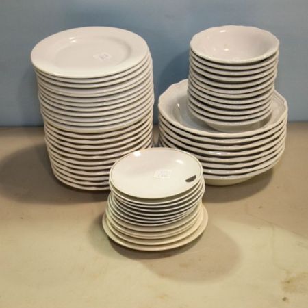 Eight Mikasa cereal bowls, twelve Rego berry bowls, eight Western Airlines bread/butter plates, five various plates, twelve 7 1/2" dia. Woodmere plates & twelve Mikasa salad plates Eight Mikasa cereal bowls, twelve Rego berry bowls, eight Western Airlines bread/butter plates, five various plates, twelve 7 1/2" dia. Woodmere plates & twelve Mikasa salad plates