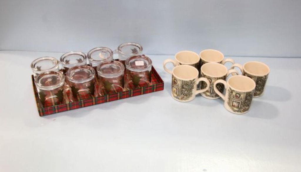 1098 Six Ceramic Christmas Mugs & Eight Glass Christmas Mugs