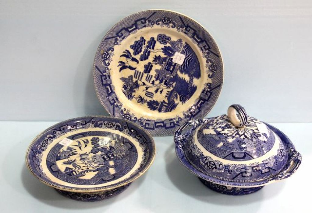 Stoneware covered vegetable (cracked), Blue Willow 11" dia. cake stand, Japan Blue Willow 12" plate Stoneware covered vegetable (cracked), Blue Willow 11" dia. cake stand, Japan Blue Willow 12" plate