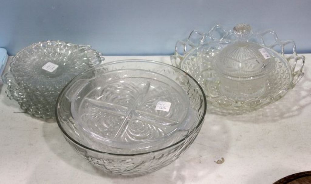 1147 Pressed Glass Fruit Bowl, Twelve Plates & Divided Dish