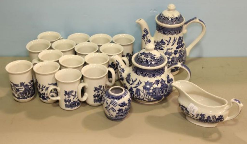 1193 Two Blue Willow Teapots, Gravy Boat, Small Vase & Fifteen Mugs