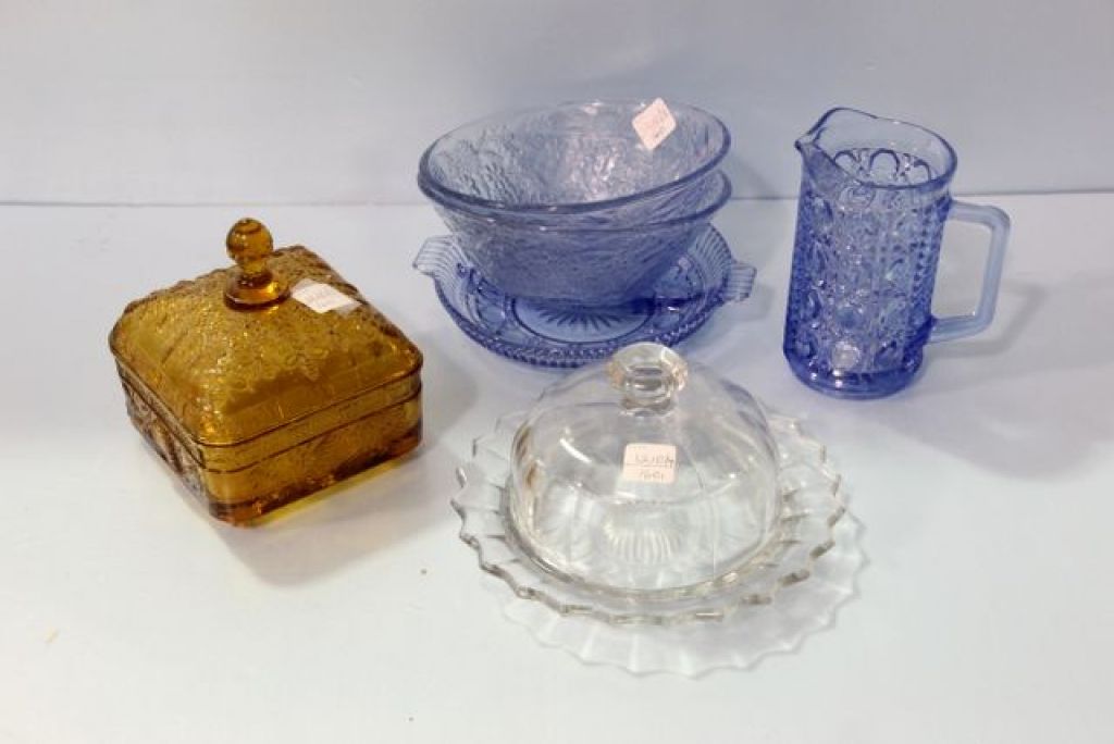 Covered glass butter dish, amber glass covered candy dish, blue glass bowls, pitcher and divided dish Covered glass butter dish, amber glass covered candy dish, blue glass bowls, pitcher and divided dish