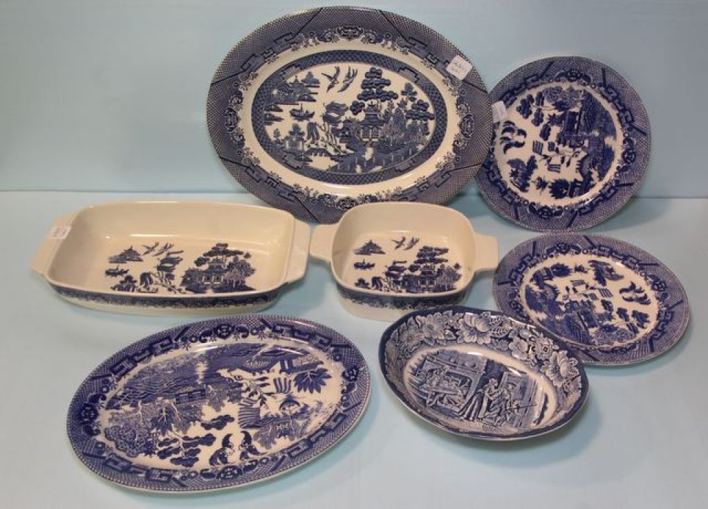 Two blue willow platters, two plates, two casseroles and Liberty blue small vegetable bowl Two blue willow platters, two plates, two casseroles and Liberty blue small vegetable bowl