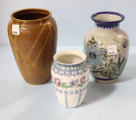 8 1/2" h. pottery vase in earth tone colors, English floral 5 1/2" h. vase and floral pottery 8" h. vase 8 1/2" h. pottery vase in earth tone colors, English floral 5 1/2" h. vase and floral pottery 8" h. vase