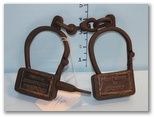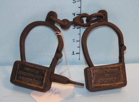 Reproduction "Property of Georgetown County" Plantation Police Shackles - reads " Woman or Child Only"; 5" h. Reproduction "Property of Georgetown County" Plantation Police Shackles - reads " Woman or Child Only"; 5" h.