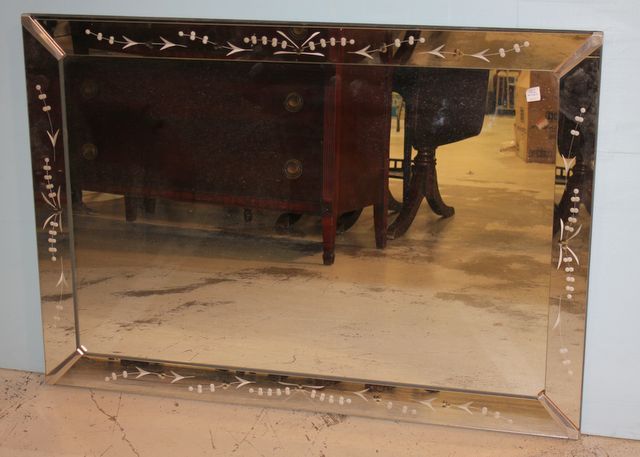 Contemporary Venetian Style Mirror with Etching; 46" w., 33 1/2" h. Contemporary Venetian Style Mirror with Etching; 46" w., 33 1/2" h.