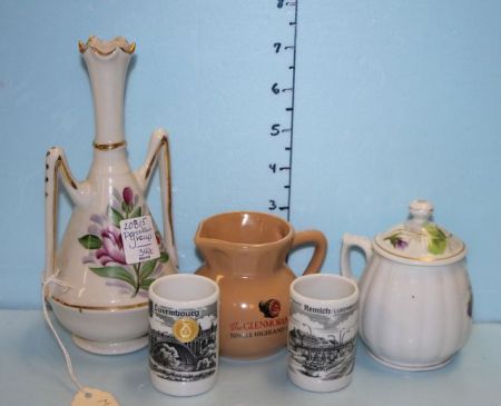 Group of Various Porcelain Items including a Germany Golf Ball, a small hand painted vase, a mustard jar, a pitcher, and two jiggers. Group of Various Porcelain Items including a Germany Golf Ball, a small hand painted vase, a mustard jar, a pitcher, and two jiggers.