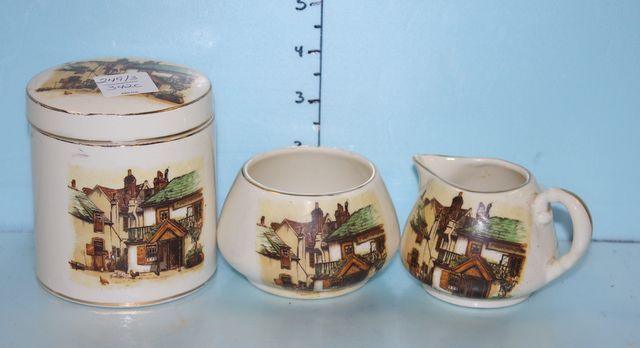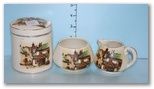 Three Pieces of Lancaster English Ware, 1890; including a pitcher, a sugar and a covered jar. Three Pieces of Lancaster English Ware, 1890; including a pitcher, a sugar and a covered jar.