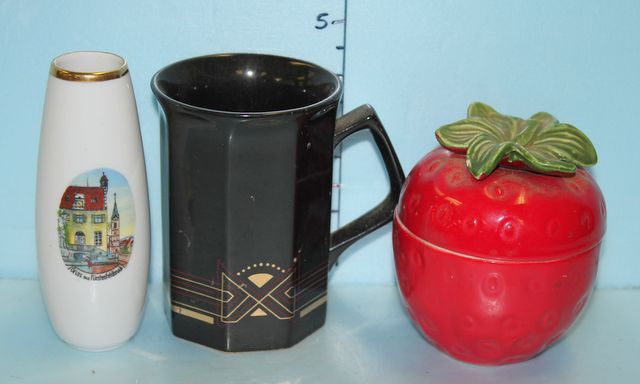 289 Ceramic Strawberry Preserve Jar, a Porcelain AK Vase, and a Modern Black Cup