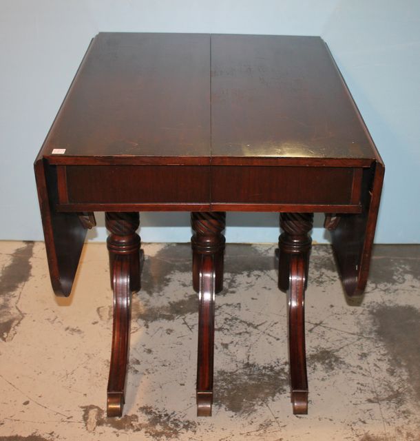 Mahogany Triple Pedestal Dropleaf Table; 57 1/2" l., 40" w., 29 1/2" h. Mahogany Triple Pedestal Dropleaf Table; 57 1/2" l., 40" w., 29 1/2" h.