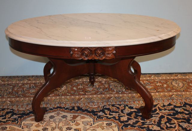 329 1960's Oval Marble Top Rose Carved Coffee Table