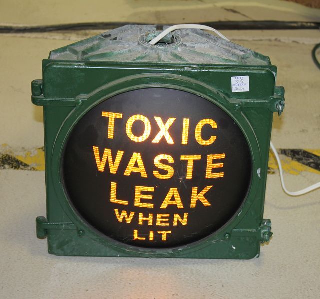 "Toxic Waste Leak When Lit" Sign, in working condition; 14" h., 14" w. "Toxic Waste Leak When Lit" Sign, in working condition; 14" h., 14" w.