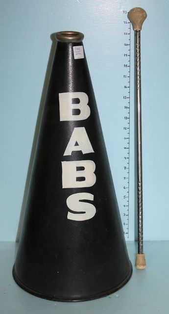 Vintage Cheerleaders Megaphone "Babs" (22 1/2" h.) with a Vintage Chrome Baton (24" l.) Vintage Cheerleaders Megaphone "Babs" (22 1/2" h.) with a Vintage Chrome Baton (24" l.)