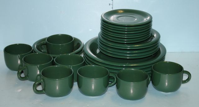 Set of Green Dishes Including Six Dinner Plates, Eight Cups, Eight Saucers, Five Salad Plates, and Two Bowls Set of Green Dishes Including Six Dinner Plates, Eight Cups, Eight Saucers, Five Salad Plates, and Two Bowls