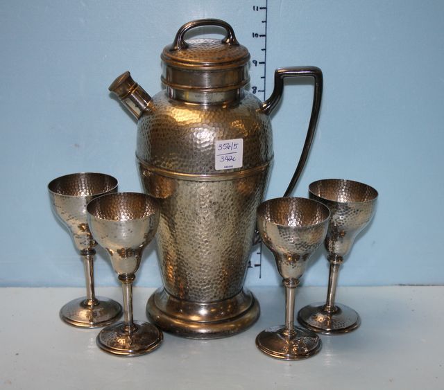 356 EPN's Hand Hammered Nickel Silver Pitcher and Four EPN's Goblets
