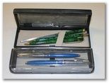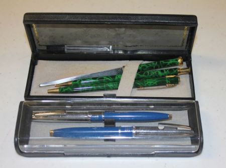 Group of Various Pens; one set of blue/silver Sheaffer pens and Made in Taiwan faux green marble pen set in box Group of Various Pens; one set of blue/silver Sheaffer pens and Made in Taiwan faux green marble pen set in box