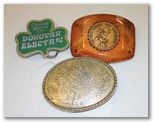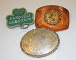 376 Gold Belt Buckle, 1984 World's Fair Medallion Buckle, and a Clover Shaped Donovan Electric Buckle
