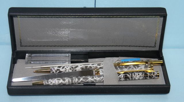 Two Pen Sets, a Letter Opener, and Refills; Grey Speckled Decorated Two Pen Sets, a Letter Opener, and Refills; Grey Speckled Decorated