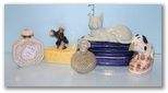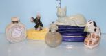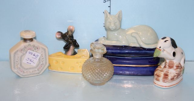 Octagon Shaped Porcelain Lenox Perfume Bottle, Pressed Glass Small Perfume Bottle (3" h.), 1993 Hand Painted Figurine of Rabbit, Ceramic Mouse and Cheese Figurine, and a Reclining Cat Box (made in Japan) Octagon Shaped Porcelain Lenox Perfume Bottle, Pressed Glass Small Perfume Bottle (3" h.), 1993 Hand Painted Figurine of Rabbit, Ceramic Mouse and Cheese Figurine, and a Reclining Cat Box (made in Japan)