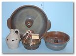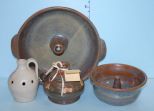 Collection of Frank Stewart Pottery including a bowl with handles, a mold, a Williamsburg mini jug, and a Thomas Pottery jug Collection of Frank Stewart Pottery including a bowl with handles, a mold, a Williamsburg mini jug, and a Thomas Pottery jug