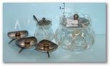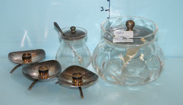 Three Mini Denmark Silver Candlesticks, a Clear Crystal Covered Dish, and a Mini Condiment with Spoon Three Mini Denmark Silver Candlesticks, a Clear Crystal Covered Dish, and a Mini Condiment with Spoon
