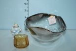 Glass Dish, an Amber Etched Salt, and a Facet Glass Dish, an Amber Etched Salt, and a Facet