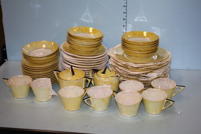 Group of Dishes including seventeen Czech. Fruit dishes, thirteen Selb Bavarian saucers, twelve yellow luster salad plates, seven Selb Bavarian cups, ten Selb Bavarian 8" plates, creamer and sugar Group of Dishes including seventeen Czech. Fruit dishes, thirteen Selb Bavarian saucers, twelve yellow luster salad plates, seven Selb Bavarian cups, ten Selb Bavarian 8" plates, creamer and sugar
