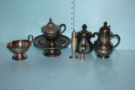 Group of Silverplate Items; small pots, sugar, salt, and a compote Group of Silverplate Items; small pots, sugar, salt, and a compote