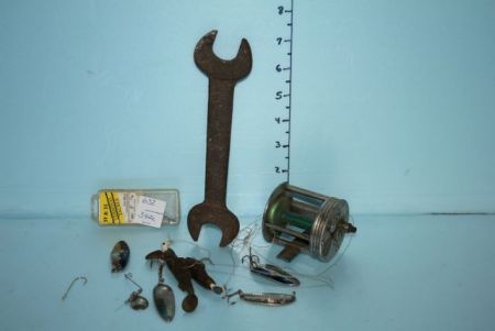 Fishing Lures, Reel, and a Rusted Wrench Fishing Lures, Reel, and a Rusted Wrench