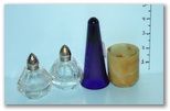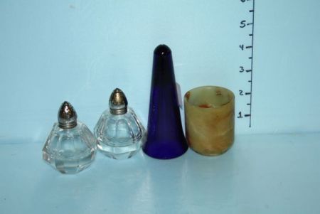 Small Blue Glass Flower Holder, Jade Cup, and a Pair of Glass Salt and Pepper Shakers Small Blue Glass Flower Holder, Jade Cup, and a Pair of Glass Salt and Pepper Shakers