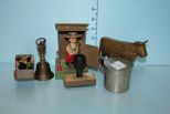 664 Small Brass Bell, Bronze Cow, Rubber Stamps, Pewter Condiment, and a Young Farmer in the Outhouse