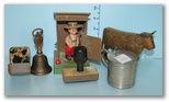 Small Brass Bell, Bronze Cow, Rubber Stamps, Pewter Condiment, and a Young Farmer in the Outhouse Small Brass Bell, Bronze Cow, Rubber Stamps, Pewter Condiment, and a Young Farmer in the Outhouse