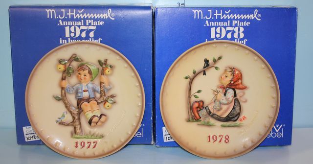 1977 Annual Hummel Plate "Apple Tree Boy" and 1978 Annual Hummel Plate "Happy Pastime"; both in original boxes and both 7 1/2" dia. 1977 Annual Hummel Plate "Apple Tree Boy" and 1978 Annual Hummel Plate "Happy Pastime"; both in original boxes and both 7 1/2" dia.