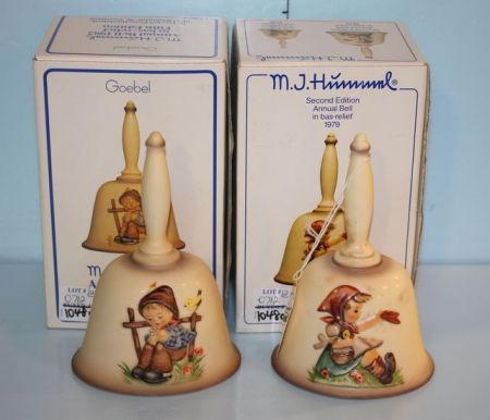 1979 Annual Hummel Bell "Farewell" and 1982 Annual Hummel Bell "She Loves Me, She Loves Me Not"; both in original boxes and both 6 1/2" h. 1979 Annual Hummel Bell "Farewell" and 1982 Annual Hummel Bell "She Loves Me, She Loves Me Not"; both in original boxes and both 6 1/2" h.