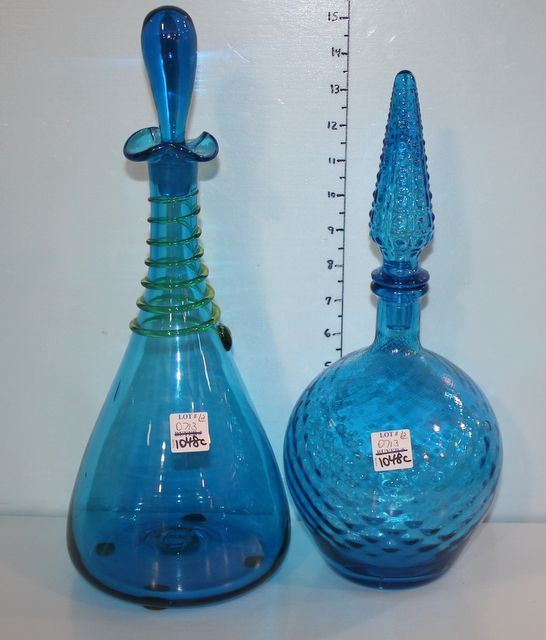 713 Blue Art Glass Decanter with Green Twisted Design and a Blue Art Glass Decanter