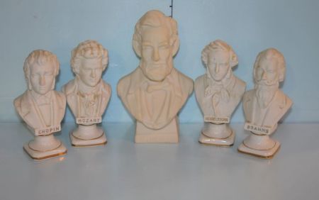 Small Lincoln Bisque Bust and Four Small Bisque Busts by Andrea; Brahms, Mozart, Mendelsschn and Chopin Small Lincoln Bisque Bust and Four Small Bisque Busts by Andrea; Brahms, Mozart, Mendelsschn and Chopin