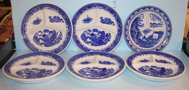 Six Heavy China Divided Plates; five are blue willow style (10 1/2" dia.) and the other one has a roman design (9 3/4" dia.) Six Heavy China Divided Plates; five are blue willow style (10 1/2" dia.) and the other one has a roman design (9 3/4" dia.)