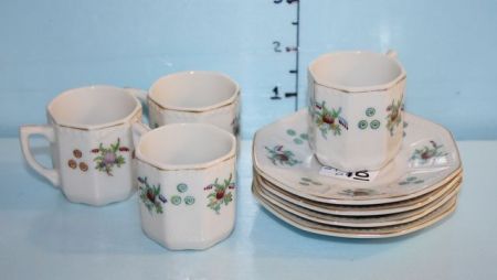 Made in Occupied Japan Demi-Tesse Cups and Saucers; four demi-tesse cups (chip on one handle), and four saucers (3 3/4" dia.) Made in Occupied Japan Demi-Tesse Cups and Saucers; four demi-tesse cups (chip on one handle), and four saucers (3 3/4" dia.)