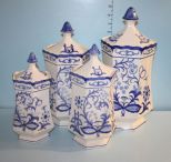 Set of Four Blue and White Canisters, made in Japan (14", 12", 10 1/2", 9 1/2" Heights) Set of Four Blue and White Canisters, made in Japan (14", 12", 10 1/2", 9 1/2" Heights)