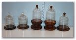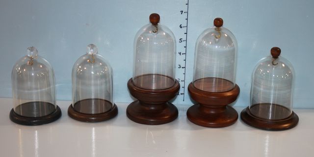 Five Pocket Watch Domes, with wooden bases; largest-7 1/2" h., 3 1/2" w., smallest-5" h., 3 1/2" w. Five Pocket Watch Domes, with wooden bases; largest-7 1/2" h., 3 1/2" w., smallest-5" h., 3 1/2" w.