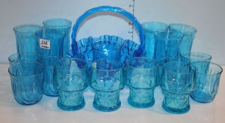 Group of Blue Anchor Hocking Glasses and a Blue Thumb Print Glass Basket; six Anchor Hocking ice tea glasses (5" h.), seven Anchor Hocking juice glasses (3" h.), and four other blue glasses (4" h.) Group of Blue Anchor Hocking Glasses and a Blue Thumb Print Glass Basket; six Anchor Hocking ice tea glasses (5" h.), seven Anchor Hocking juice glasses (3" h.), and four other blue glasses (4" h.)