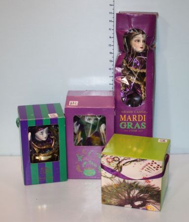 Grand Casino Mardi Gras Porcelain Dolls and Snow Globe; collector dolls in original boxes 19", 9 1/2" , 8" heights, and a snow globe 5" h. Grand Casino Mardi Gras Porcelain Dolls and Snow Globe; collector dolls in original boxes 19", 9 1/2" , 8" heights, and a snow globe 5" h.