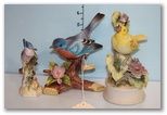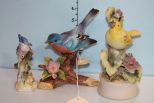 Group of Three Bird Figurines; royal crown yellow canary 6 1/2" h., royal Adderly bone china American blue jay 4 3/4" h., and Andrea by Sadek blue bird 6" h. Group of Three Bird Figurines; royal crown yellow canary 6 1/2" h., royal Adderly bone china American blue jay 4 3/4" h., and Andrea by Sadek blue bird 6" h.