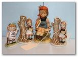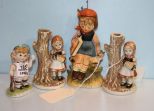 Group of Four Porcelain Figurines; Hummel "like" figurine of Artist Girl stamped designed by Erich Stauffer 6" h., a pair of Hummel "like" candlestick holders (one repaired) 4 1/2" h., and a porcelain figurine of a little girl playing tennis 4" h. Group of Four Porcelain Figurines; Hummel "like" figurine of Artist Girl stamped designed by Erich Stauffer 6" h., a pair of Hummel "like" candlestick holders (one repaired) 4 1/2" h., and a porcelain figurine of a little girl playing tennis 4" h.