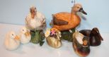 Group of Bird Figurines; two duck figurines, one orange and one grey 6" h., matching pair of white ducks 2 3/4" h., a small duck platter 2 3/4" h., a wooden duck paper weight 2 3/4" h., and a small brass swan with flowers Group of Bird Figurines; two duck figurines, one orange and one grey 6" h., matching pair of white ducks 2 3/4" h., a small duck platter 2 3/4" h., a wooden duck paper weight 2 3/4" h., and a small brass swan with flowers
