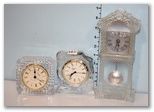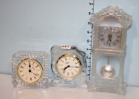 Three Crystal Desk Clocks; grandfather clock style 9 1/4" h., Staiger Quarty Clock 4" h., 4" w., and an Elgin Quarty Clock 4 1/2" h., 4" w. Three Crystal Desk Clocks; grandfather clock style 9 1/4" h., Staiger Quarty Clock 4" h., 4" w., and an Elgin Quarty Clock 4 1/2" h., 4" w.
