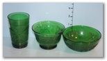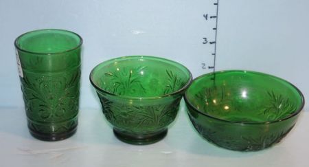 Three Green Glass Pieces, two bowls 4 1/4" dia., 3 1/2" dia., and one cup 3 1/2" h. Three Green Glass Pieces, two bowls 4 1/4" dia., 3 1/2" dia., and one cup 3 1/2" h.