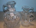 Three Glass Pitchers with a Glass Covered Dish; Pitchers 6 1/4" h., 4 3/4" h., 4" h., and covered dish 6 1/4" h., 6" dia. Three Glass Pitchers with a Glass Covered Dish; Pitchers 6 1/4" h., 4 3/4" h., 4" h., and covered dish 6 1/4" h., 6" dia.