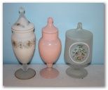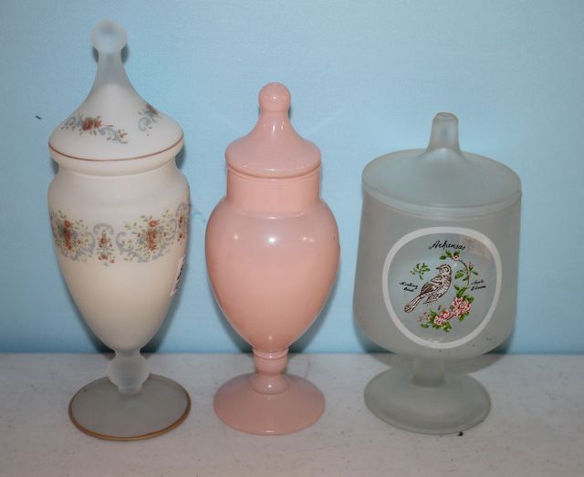 Group of Covered Jars; white satin glass with floral design 10" h., peach color glass 8 1/2" h., and a frosted glass with Arkansas State Bird and Flower 8" h. Group of Covered Jars; white satin glass with floral design 10" h., peach color glass 8 1/2" h., and a frosted glass with Arkansas State Bird and Flower 8" h.