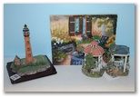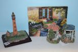 Group of Four Resin Landscapes; wall plaque of garden 7" h., 9" w., two small gazebos 3 1/2" h., 3 1/2" w., lighthouse landscape 6 1/2" h. Group of Four Resin Landscapes; wall plaque of garden 7" h., 9" w., two small gazebos 3 1/2" h., 3 1/2" w., lighthouse landscape 6 1/2" h.